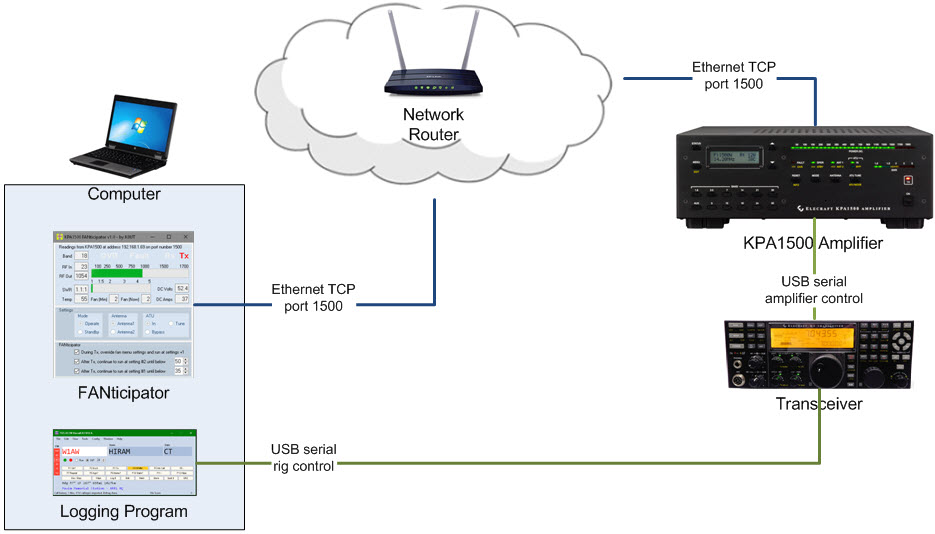 The KPA1500 amplifier can essentially be located anywhere that the Internet reaches. For security reasons, we strongly recommend that you establish a Virtual Private Network (VPN) between your logging computer and the remote KPA1500 amplifier. Depending on the quality of your connection, you might want to adjust <PollInterval> in fanticipator.xml. The default value is 500ms… start with 1000ms (1 second) and see how that works.