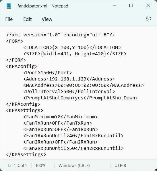 The program will open a Windows NOTEPAD edit screen containing the fanticipator.xml configuration file