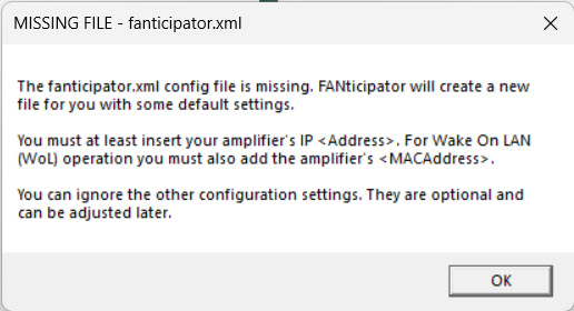 The first time you run FANticipator, a warning dialog box will appear advising you that there is no fanticipator.xml configuration file.