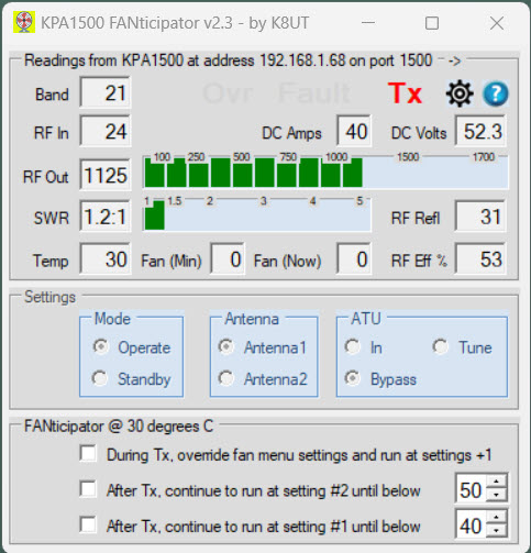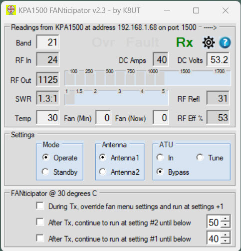 - The FANticipator Console enables the fan speed controls During Tx, AfterTx Setting #1, AfterTx Setting#2 and the KPA1500 settings for Operate/Standby, Antenna1/Antenna2, ATU In/Bypass/Tune
